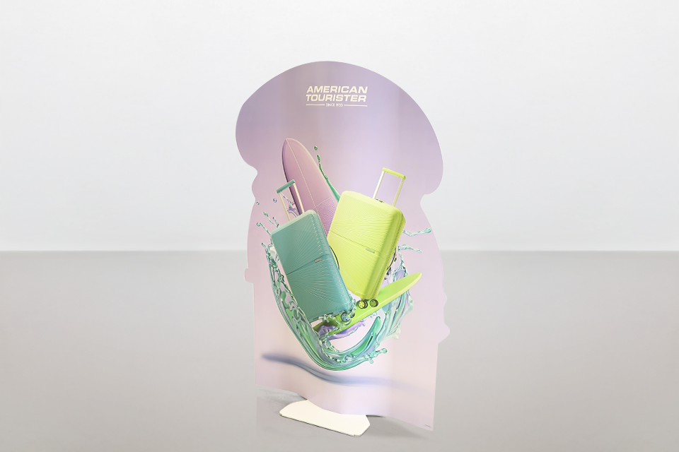 The display is printed on both sides and therefore ideally suited for use in an open space. This display is available in heights ranging from 15 cm to 190 cm.